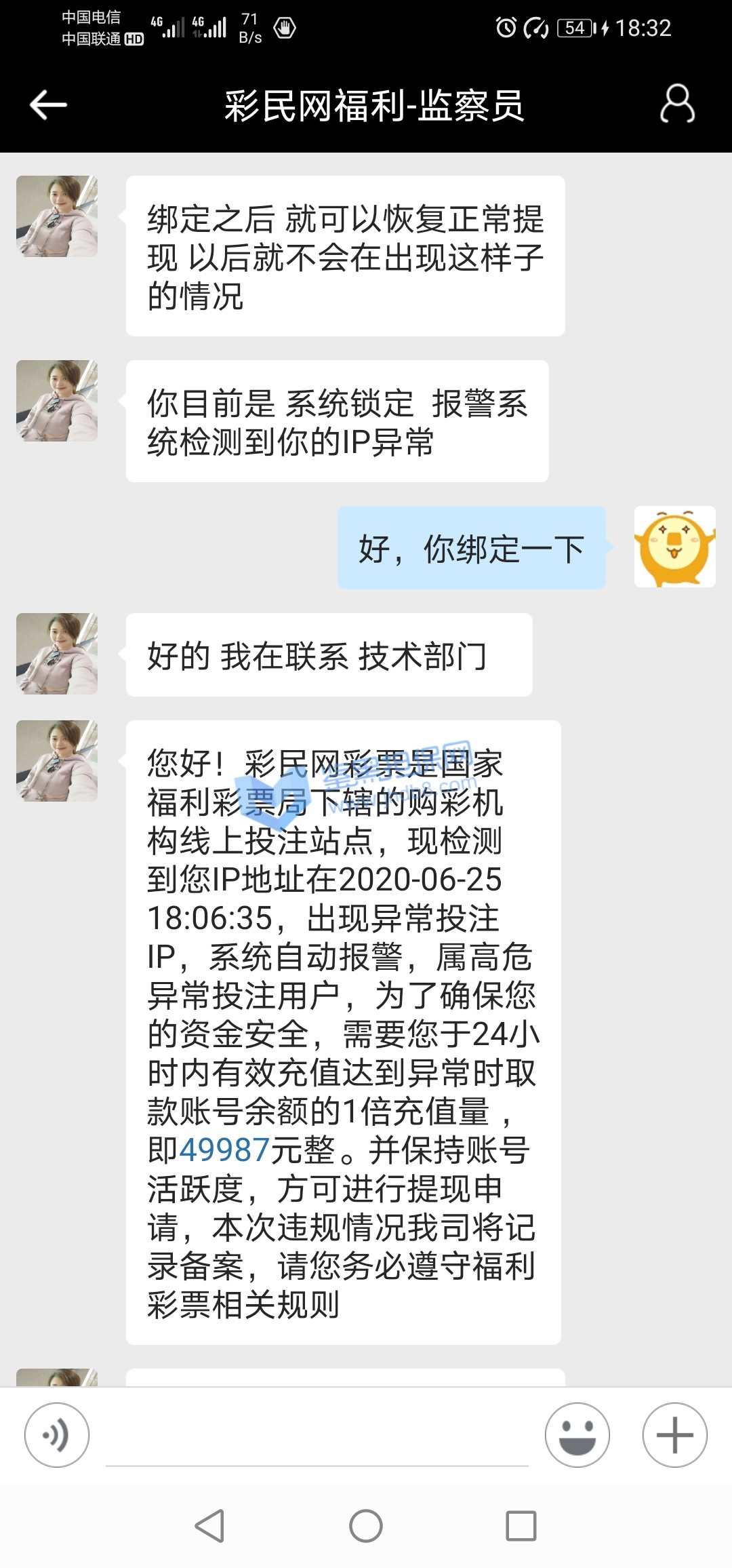 我之前在幸运彩票平台充值2000,打码赢到2800想要提现,但是提现未到账,联系导师以最近风控较严,投注违规为由不给出款,第二天提款金额返回到账户,但是要打50倍流水才能提现,我又投注了几天,提现需要的流水又增加了两倍,需要27万多才可以提现,联系导师说是可以做全码的包赚方案,还可以清除27万流水,我再三和导师确认是不是只要充值五万就可以做包赚方案清除流水然后提现,导师很肯定的回答是,我就贷款充值了五万,充值成功十多分钟后,导师说是我的账号被系统自动升级成十万的方案,要我在24小时之内完成再充值五万做十万的方案,否则就会封号,还要交违约金才能解封,我当时因为之前的五万都是贷款的,也没有什么钱充值,导师就叫我和朋友借,说是只要再充值五万做完方案就能全部提现。第二天导师和我说有多少先充值多少,她和主管求情帮我延期,我因为害怕被封号交违约金,第二天和朋友借了10000充值进去,第三天又是想同的理由又充值了6000,后面实在没钱了就没在充值,第五天他们就冻结了我的账号,不能登录,我和导师说我实在没钱在充值了,导师回复我说叫我再想想办法,她做担保把我的账号先解封了,要让我充值满十万做全码活动,否则账户里面的钱就要清零。现在我充进去的钱也不能提现,里面的钱全部都是贷款和借的,我希望能提出充进去的本金。