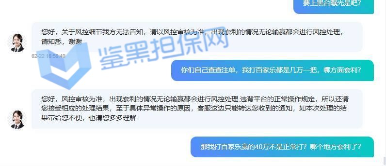 3、鉴黑担保网维权专员联系该平台相关情况,对方反馈此会员被厅方检测出来违规投注行为,网站拒绝出款表示不再欢迎进入游戏,维权专员让其提供厅方反馈的相关资讯进行复查,对方无法提供后拒绝更多沟通,可见是针对盈利较多玩家的放弃行为,但余额没有出款完毕行为与黑平台无异,还请广大玩家远离!!